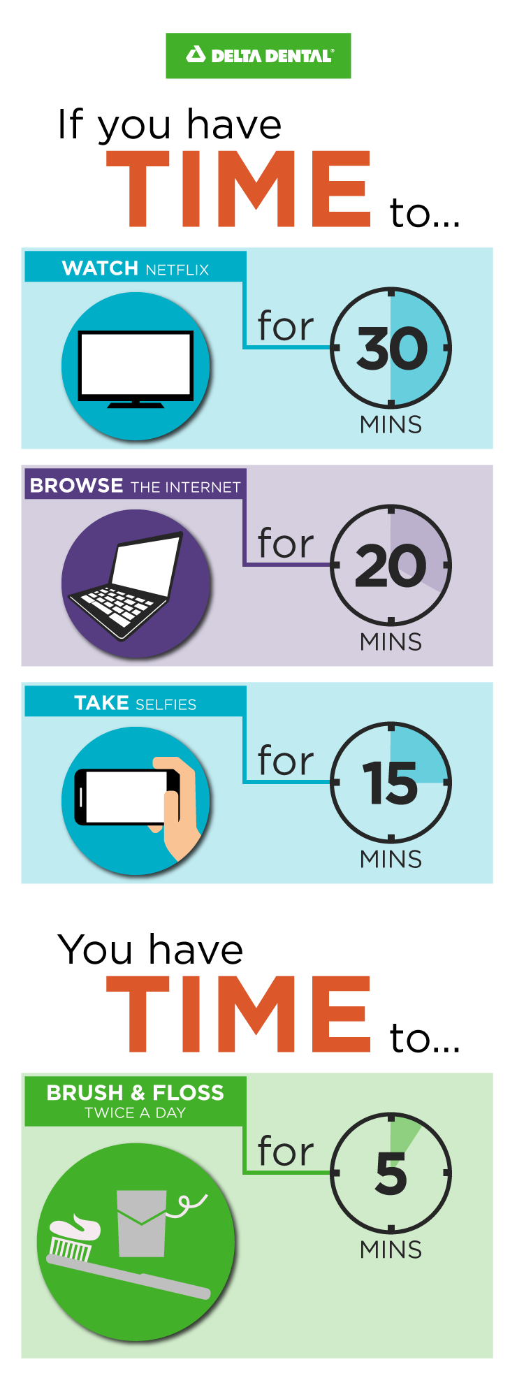 We figure if you have time for Netflix-binging, online-browsing, and selfie-sessions, then you definitely have time for a proper oral hygiene routine. A good dental routine includes thoroughly brushing with a fluoride toothpaste for two minutes in the morning and two at night. Follow that up with consistent flossing, and it doesn’t even add up to the amount of time the average millennial spends taking selfies.