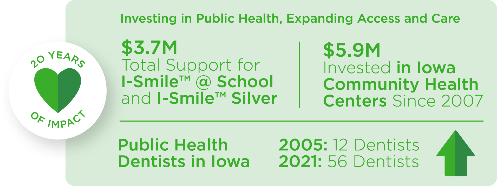 Investments in community water fluoridation projects and continuing education opportunities for the oral health profession.
